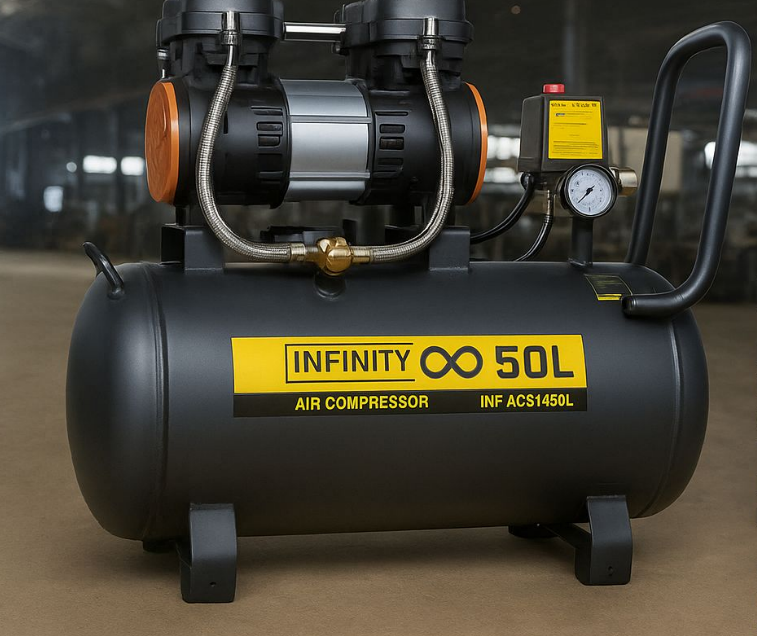 Brand: Infinity Power Tools Model: INF ACS1450L Capacity (Tank Size): 50 Liter Type: Oil-Free Air Compressor Motor: Heavy-duty dual cylinder motor Pressure Gauge: Yes